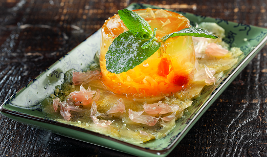 - Para finalizar, Gelatina de Flor de Maio, com o sabor rico do pomelo e abacaxi, para refrescar o palato e desejar a todos um ano doce e pleno de sucesso.
